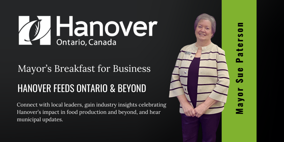 Celebrate the strength of Hanover’s food production sector at this year’s Mayor’s Breakfast for Business, hosted by Mayor Sue Paterson. Themed “Hanover Feeds Ontario & Beyond,” the event features a dynamic panel of local industry leaders—including Maple Leaf Foods, Blue Springs Trout Farms, Exceldor, and P&H Milling—sharing insights on market expansion, trade challenges, and the vital role of local manufacturing in our economy.