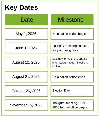 Nominations for the 2026 Municipal Election open on Friday, May 1, 2026 and close Friday, August 21, 2026 at 2:00pm.