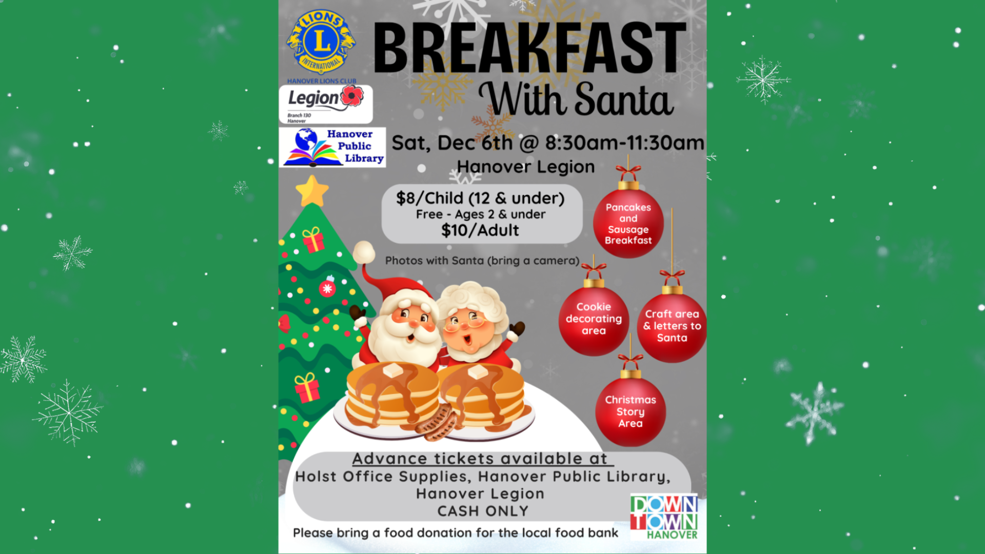 π $8/child (12 & under), $10/adult | Ages 2 & under FREE Advance tickets at Holst Office Supplies, Hanover Public Library, Hanover Legion (Cash only).